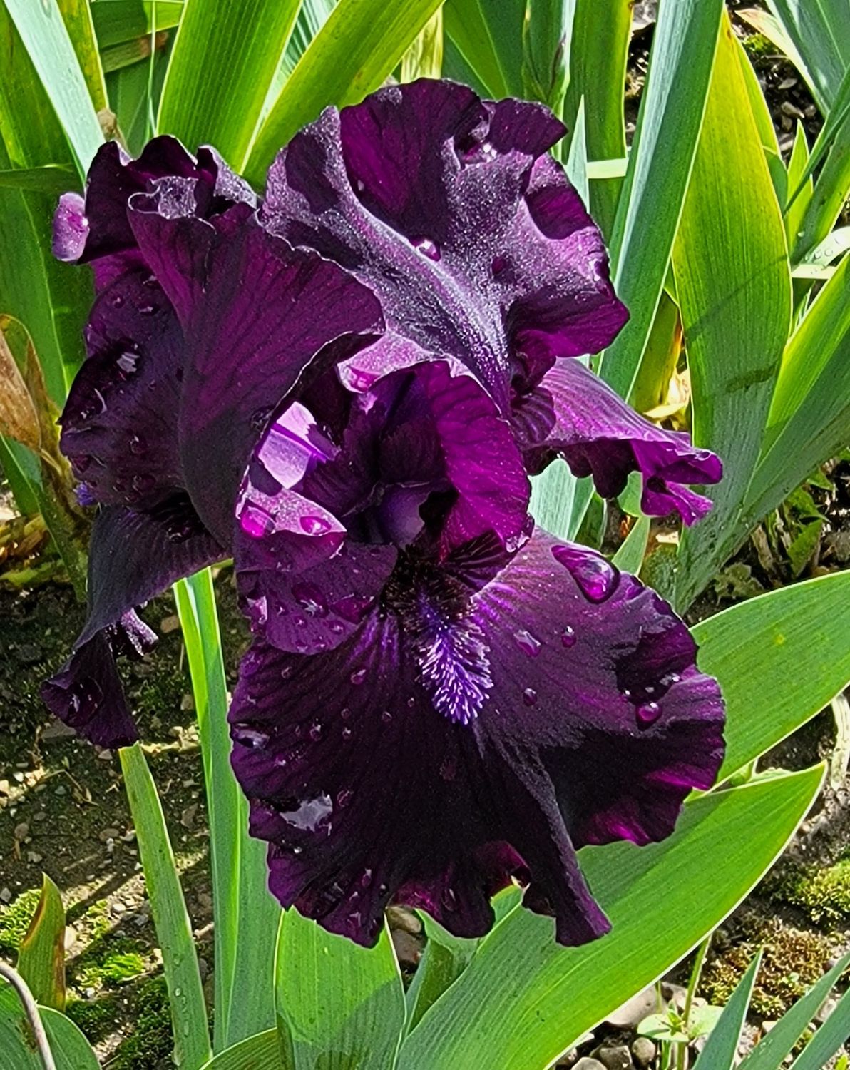 'Midnight Sharp' Sutton R. 2009). IB, 25" (64 cm), Early midseason bloom. Standards, style arms and falls black purple; beards black purple base, hairs tipped rust; ruffled; musky fragrance